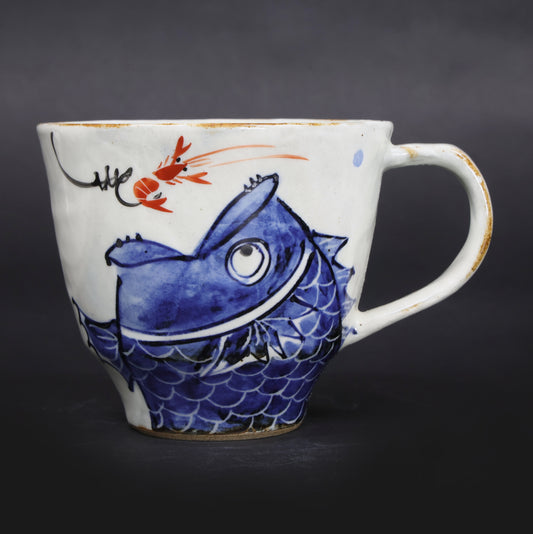 Hasami Ware Mug “Catching a Sea Bream with a Shrimp” (Blue) | Hand-Painted Japanese Pottery Cup | Japanese handmade