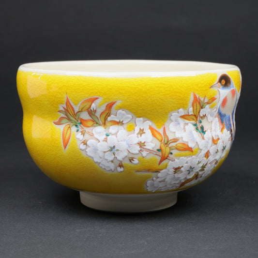 Japanese Kutani Porcelain Tea Bowl – Hand-Painted Sakura & Bird Design, Japanese Pottery Gift, Cherry blossoms and birds, Gold Trim, Free shipping