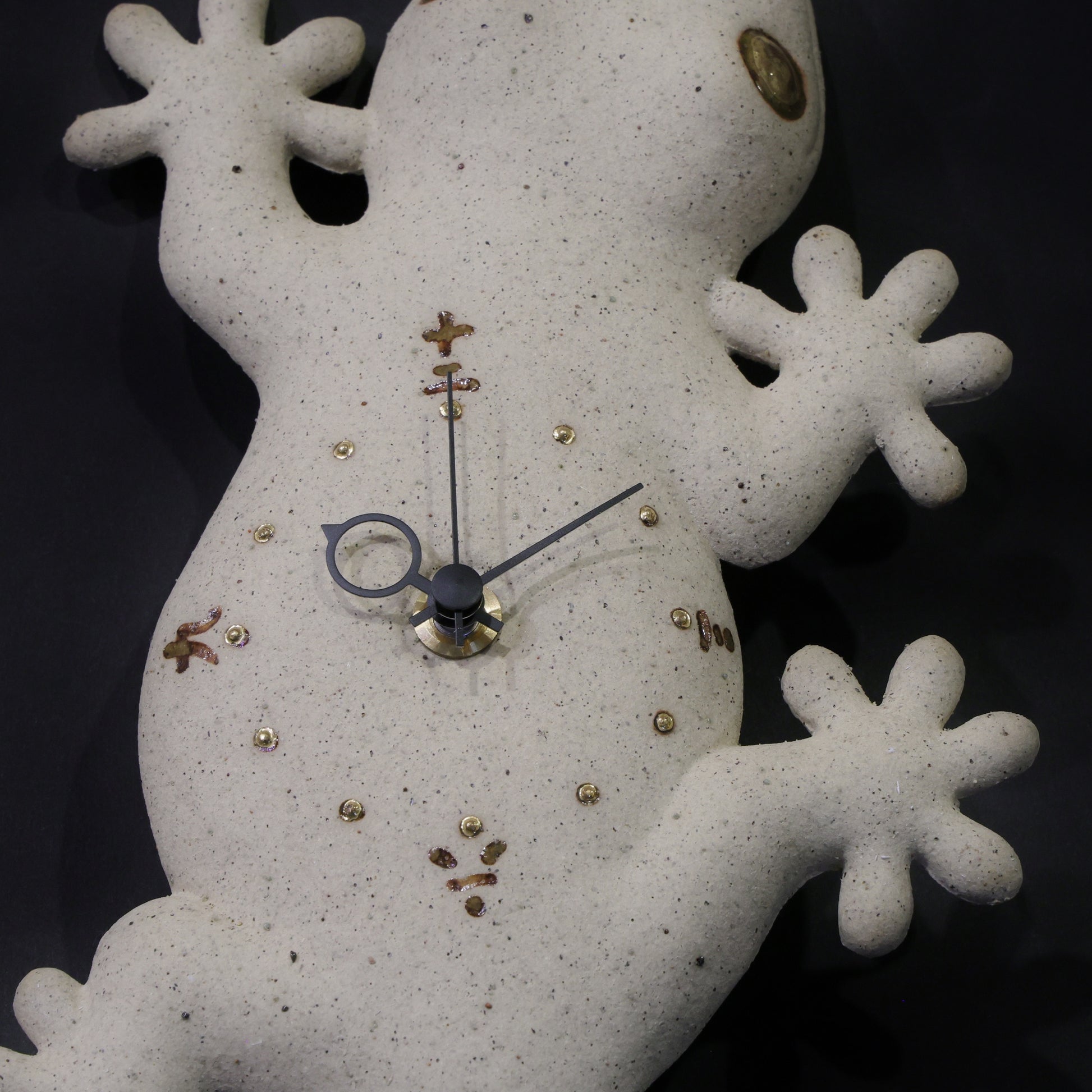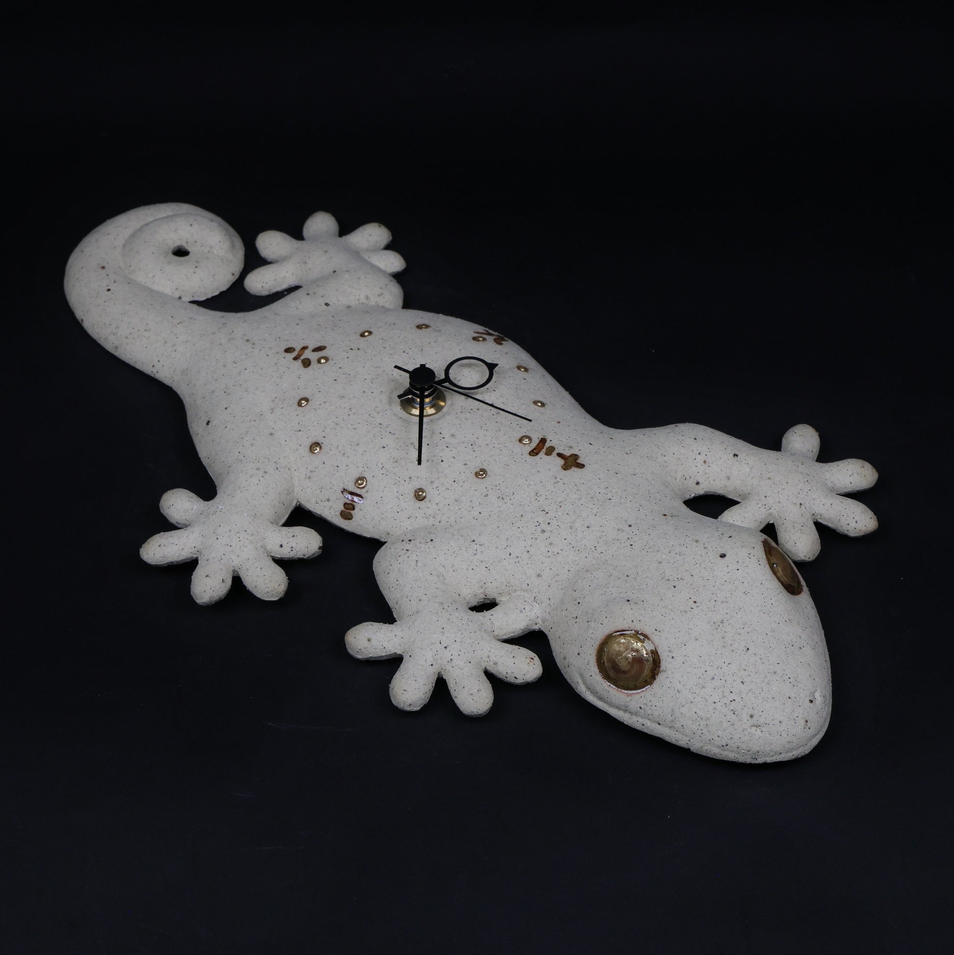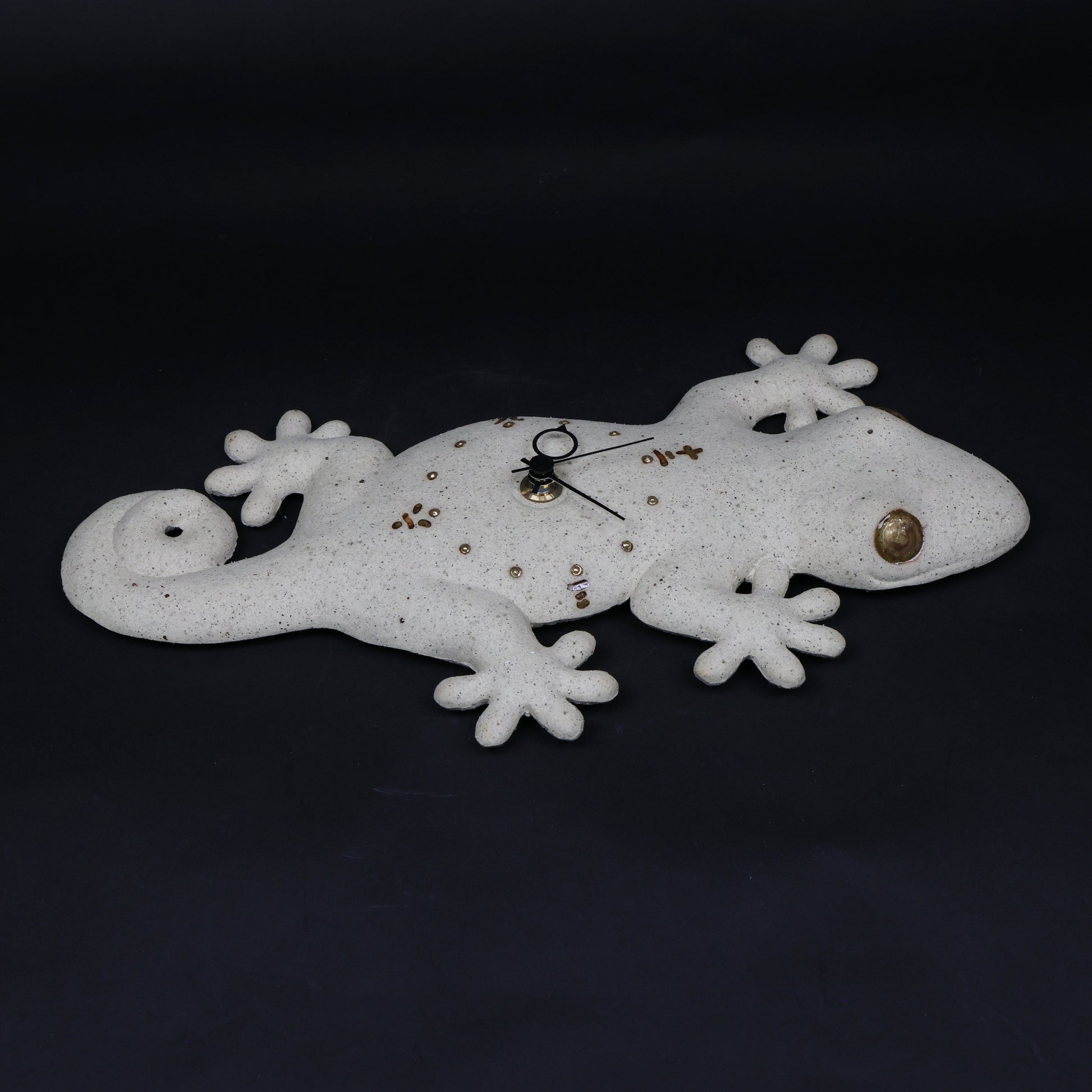 The clock is made from hand-fired stoneware with a natural, textured finish. Delicate gold accents highlight the gecko’s eyes and the 12 hour markers, adding a subtle, elegant glow. Its playful and charming design brings both personality and a sense of protection to any wall.