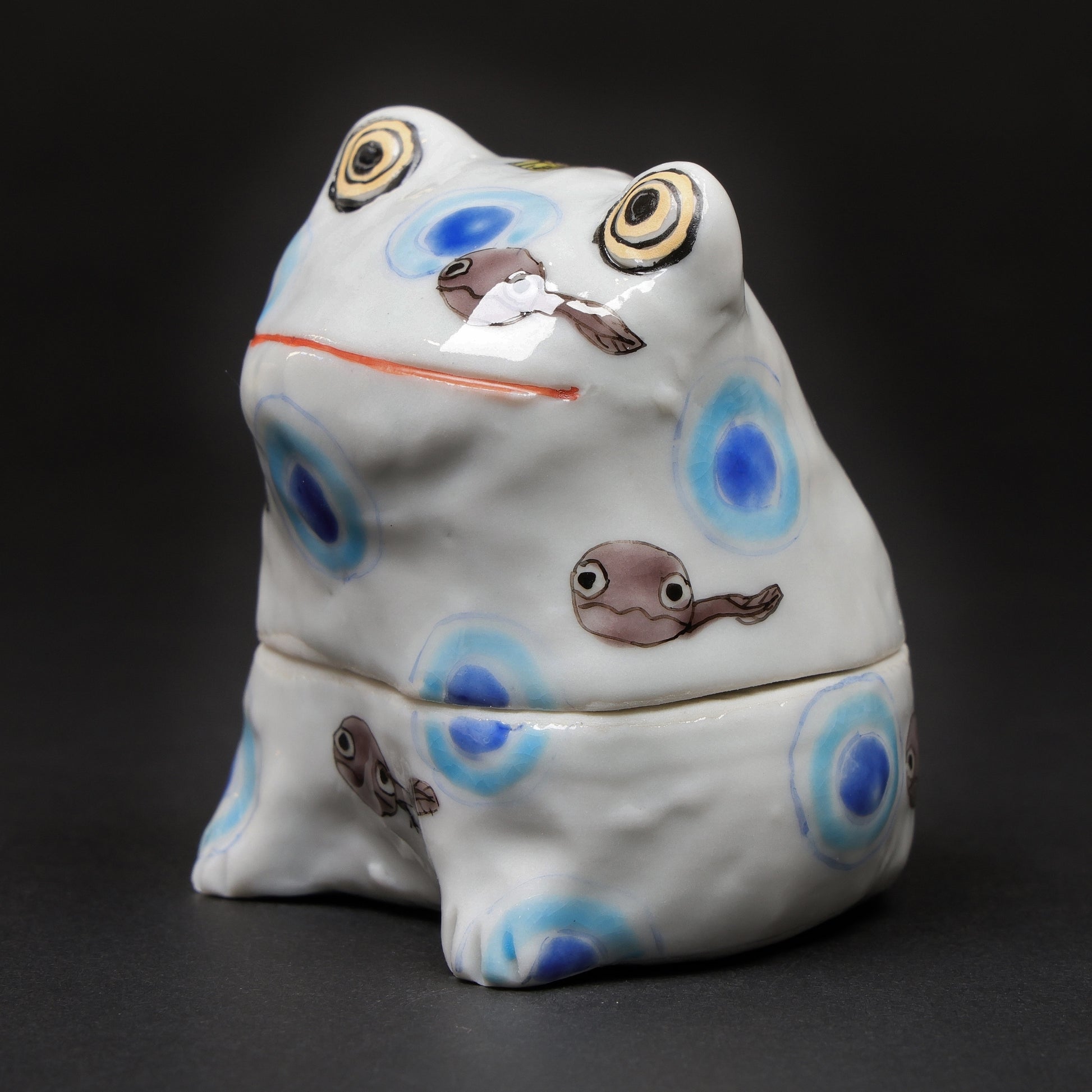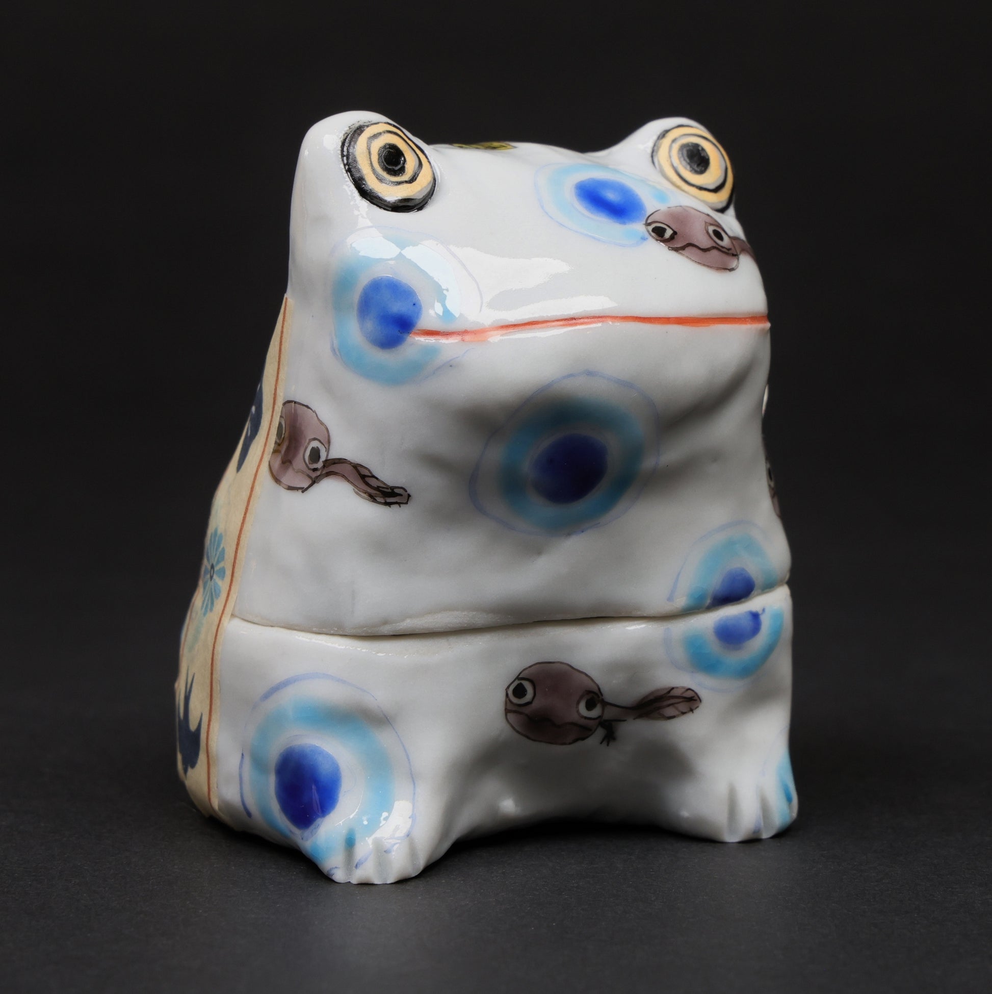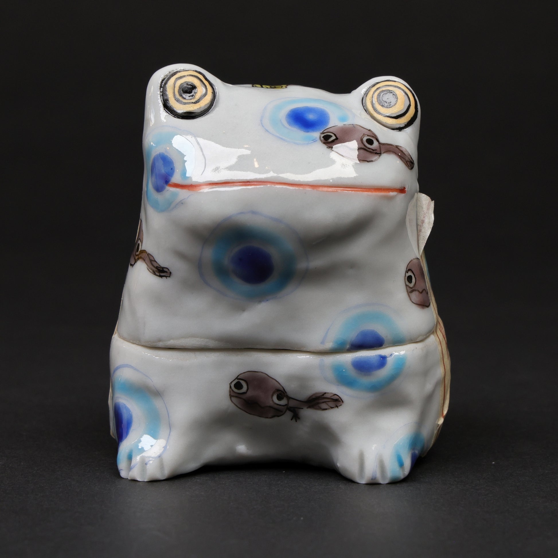 Lovingly created by skilled Japanese artisans, this frog-shaped lidded container features a delightful parent-and-child frog motif with hand-painted tadpole details. The whimsical expressions and smooth texture make it both a functional and artistic piece.