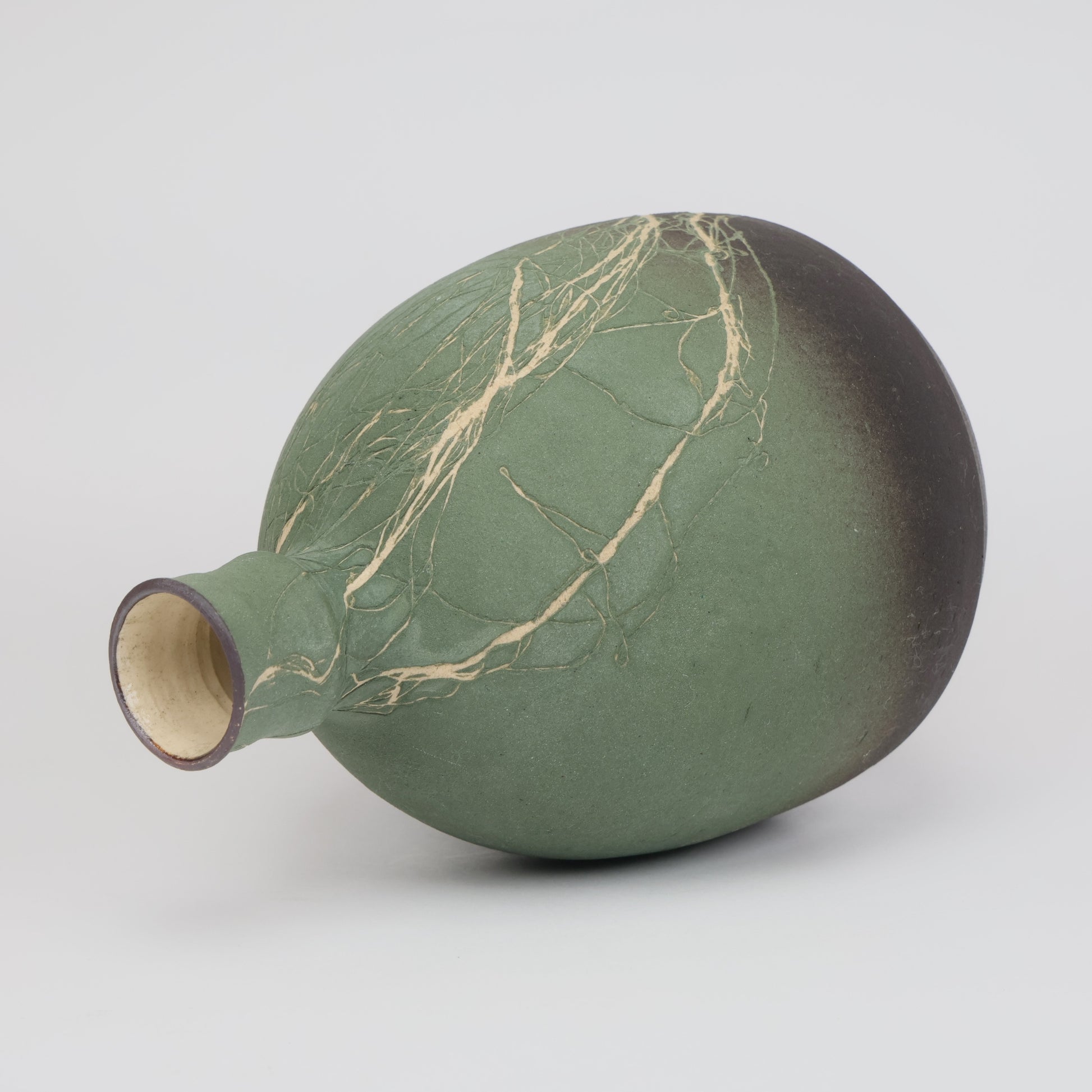 “Raiju” is a unique Kasama ware bud vase, where deep green clay is traced with white streaks like lightning across the sky.
