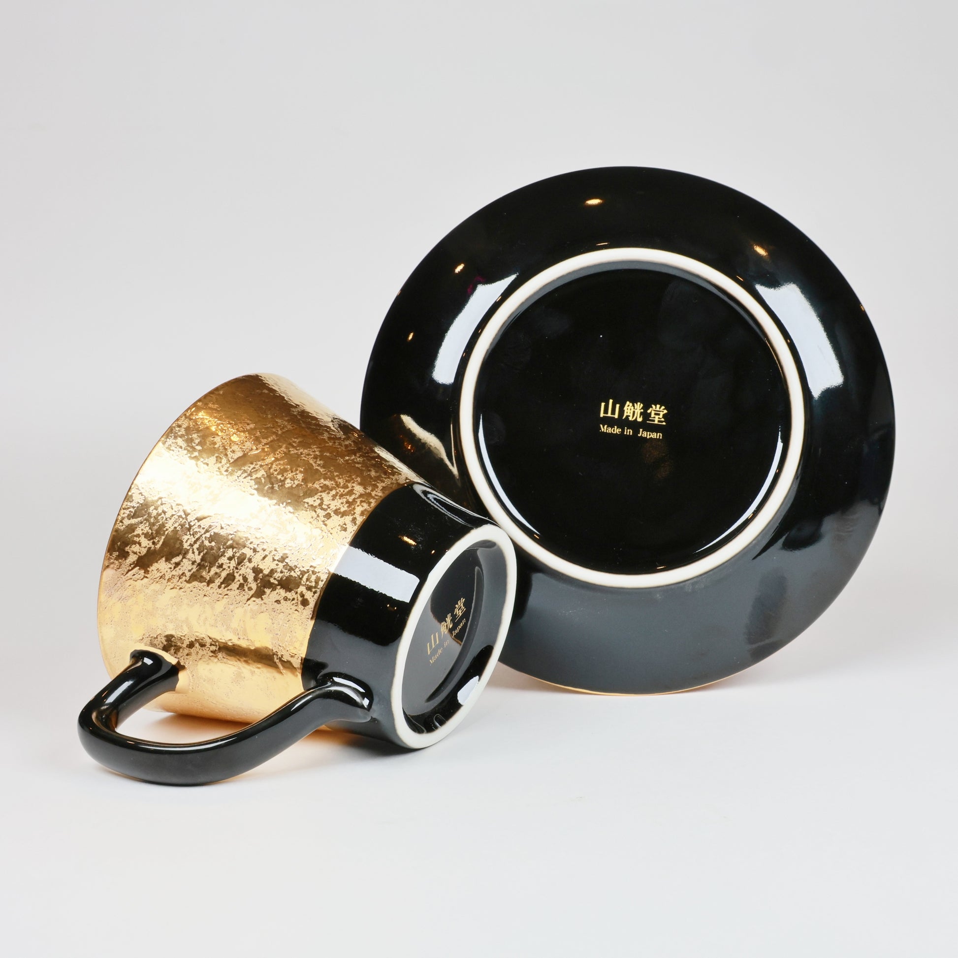This Arita porcelain coffee cup and saucer shines with the contrast of radiant gold and deep black.